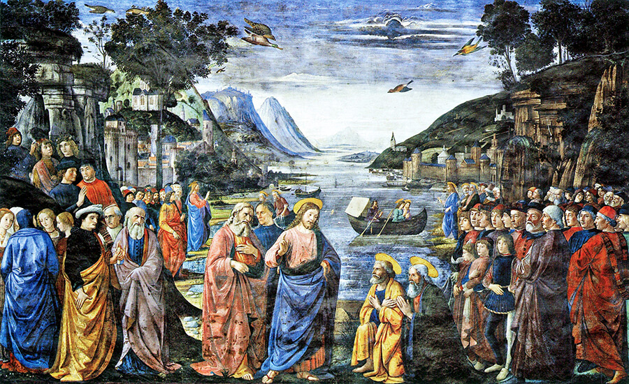Als Jesus am See von Galiläa entlangging, sah er zwei Brüder, Simon, genannt Petrus, und seinen Bruder Andreas; sie warfen gerade ihr Netz in den See, denn sie waren Fischer. Da sagte er zu ihnen: Kommt her, folgt mir nach! Ich werde euch zu Menschenfischern machen.